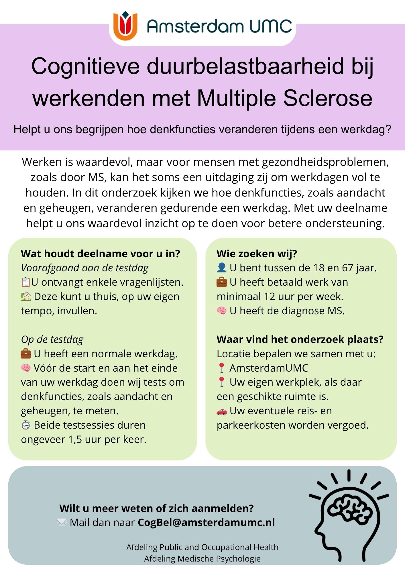 Meer informatie over het onderzoek vindt je in de flyer en via de volgende link: Cognitieve duurbelastbaarheid bij werkenden met Multiple Sclerose (MS) | Polikliniek Mens en Arbeid